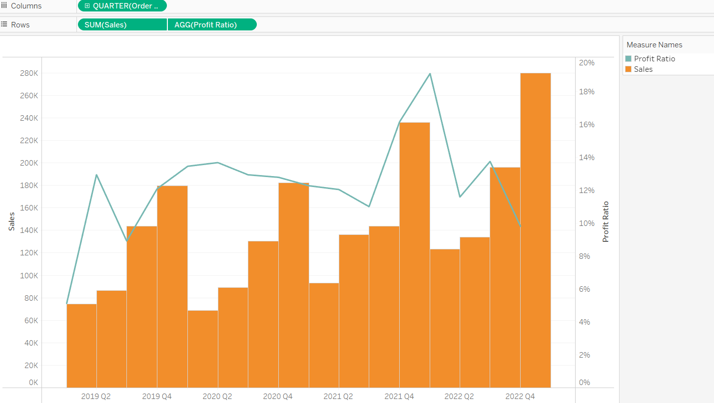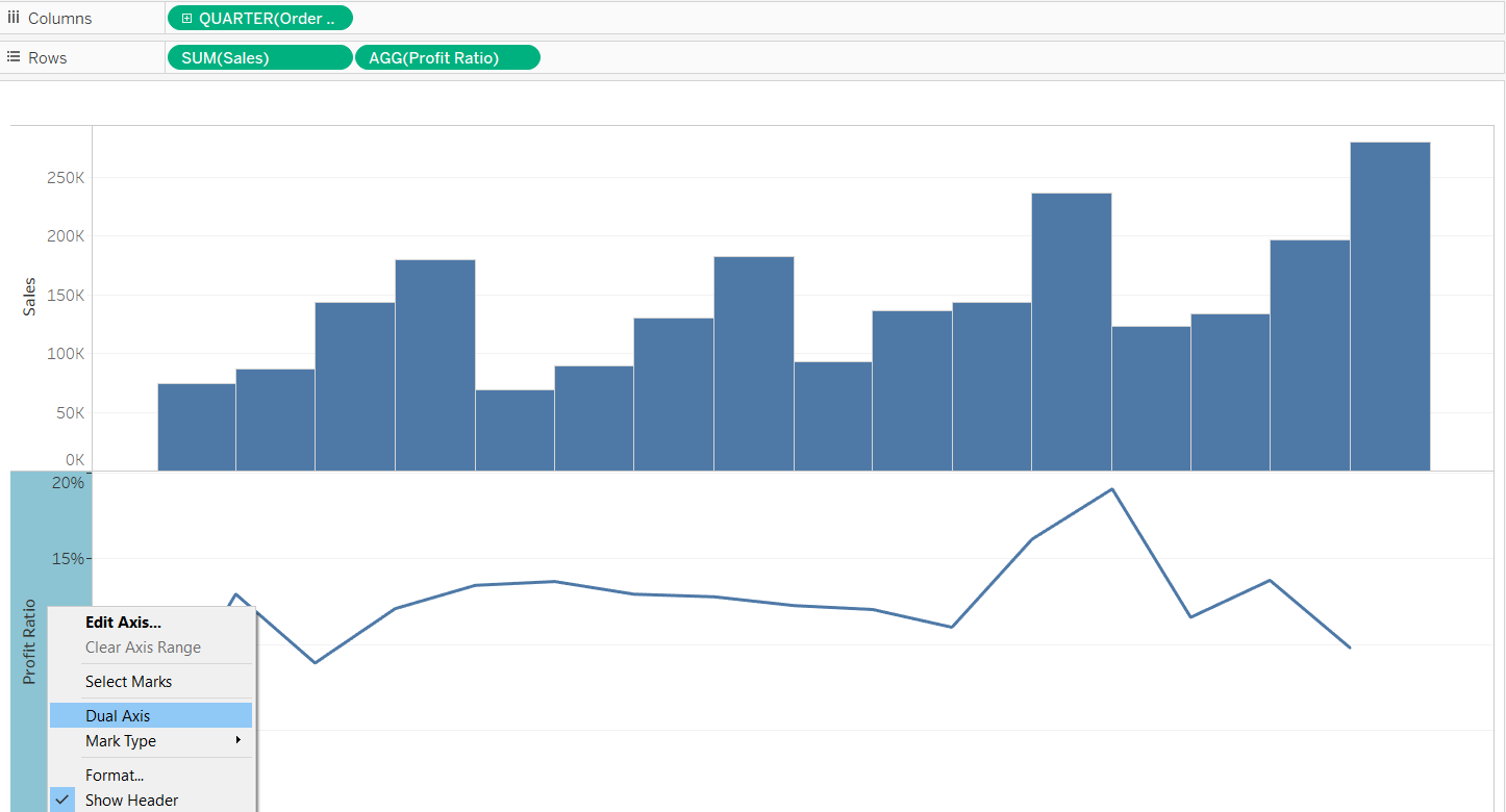 To create a Dual Axis chart, follow the below steps Drag the order date dimension to the column shelf Now drag the sales to the row self By default, sales will be taking the sum of salesChange the range if necessary Keep in mind how the data set range will change if the data updates A fixed axis may be good for now, but it may provide long term flexibility to represent all of theRight click on the second "Latitude" measure and select "Dual Axis", you're now back to a single map but you have 2 marks card tabs, one for each axis As an aside, if you're doing a dual axis
